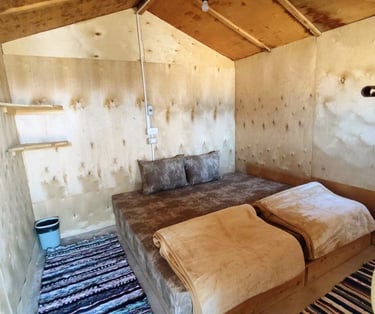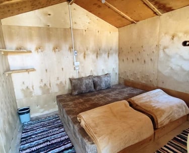 Vår bungalow med delt bad og vifte. Det delte badet har private lugarer i en sanitærblokk.